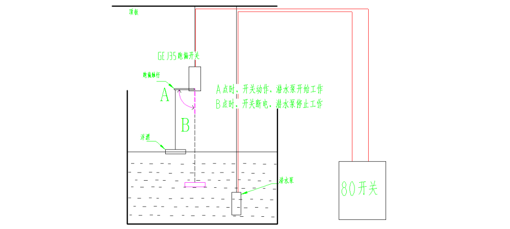 當(dāng)水倉(cāng)水位上升到一定高度時(shí),“浮漂”上浮,浮漂帶動(dòng)跑偏裝置的觸桿上揚(yáng),到達(dá)A點(diǎn)時(shí)該裝置動(dòng)作,控制開關(guān)啟動(dòng),同時(shí)潛水泵開始排水。當(dāng)水位下降到一定程度時(shí),浮漂下降,帶動(dòng)跑偏裝置探桿下拉,到達(dá)B點(diǎn)時(shí),控制開關(guān)停止,該裝置動(dòng)作,潛水泵停止工作。