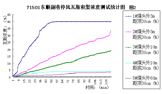 第一組試驗(yàn):在二礦71501東順副巷炮掘工作面進(jìn)行了停風(fēng)瓦斯?jié)舛扔^測(cè)試驗(yàn):盲巷長(zhǎng)度70m,3:45引爆裝有40塊藥的8個(gè)拉槽炮,4:00將事先備好的5枚40%的瓦斯傳感器設(shè)置到預(yù)定位置,隨即停止送風(fēng)126分鐘觀測(cè)瓦斯?jié)舛茸兓?/span>
