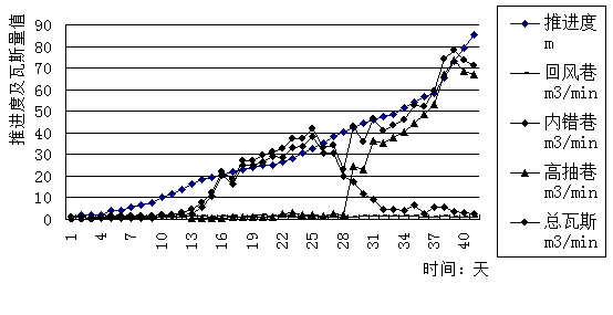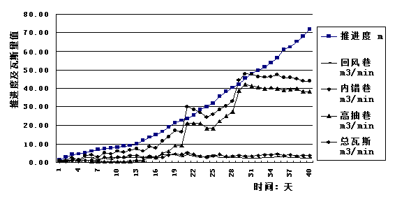 當(dāng)工作面推進(jìn)到40.25m后,總瓦斯量進(jìn)一步增加,平均值為55.20 m3/min,最大值78.01m3/min,但冒裂帶與高抽巷連通,內(nèi)錯(cuò)巷瓦斯由最大38.25 m3/min降為平均為6.27m3/min(最小2.48 m3/min),而高抽巷瓦斯排量由1.46 m3/min上升到47.72 m3/min(最高達(dá)73.66 m3/min),占總瓦斯量的86.45%(最高達(dá)94.66%)。標(biāo)志著初采期結(jié)束,工作面平均日推進(jìn)度由1.55m提高到3.46m。