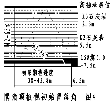 為找到綜放面初采期頂板的冒落規(guī)律,把初采瓦斯抽采巷布置在頂板初始冒落的邊緣帶上,對(duì)5個(gè)沒有布置初采瓦斯抽采巷的綜放面高抽巷開始抽排瓦斯時(shí)的推進(jìn)度值(即初采期推進(jìn)度)和瓦斯情況進(jìn)行了觀測(cè)統(tǒng)計(jì),見附表2。從5個(gè)綜放面的統(tǒng)計(jì)數(shù)據(jù)得出上隅角頂板的視初始冒落角度為62o~66o,見圖4示。據(jù)此,在80613綜放面用一條小斷面、大仰角的初采瓦斯處理巷,將上隅角與走向高抽巷溝通,詳見圖1。