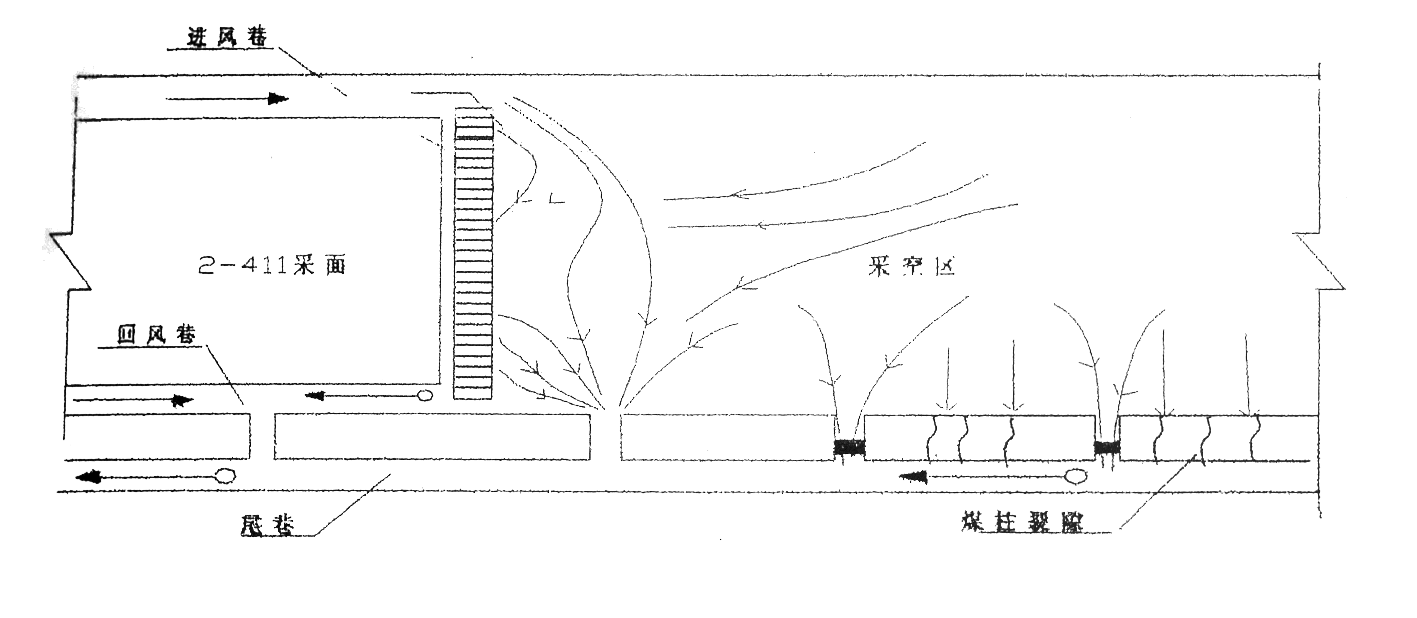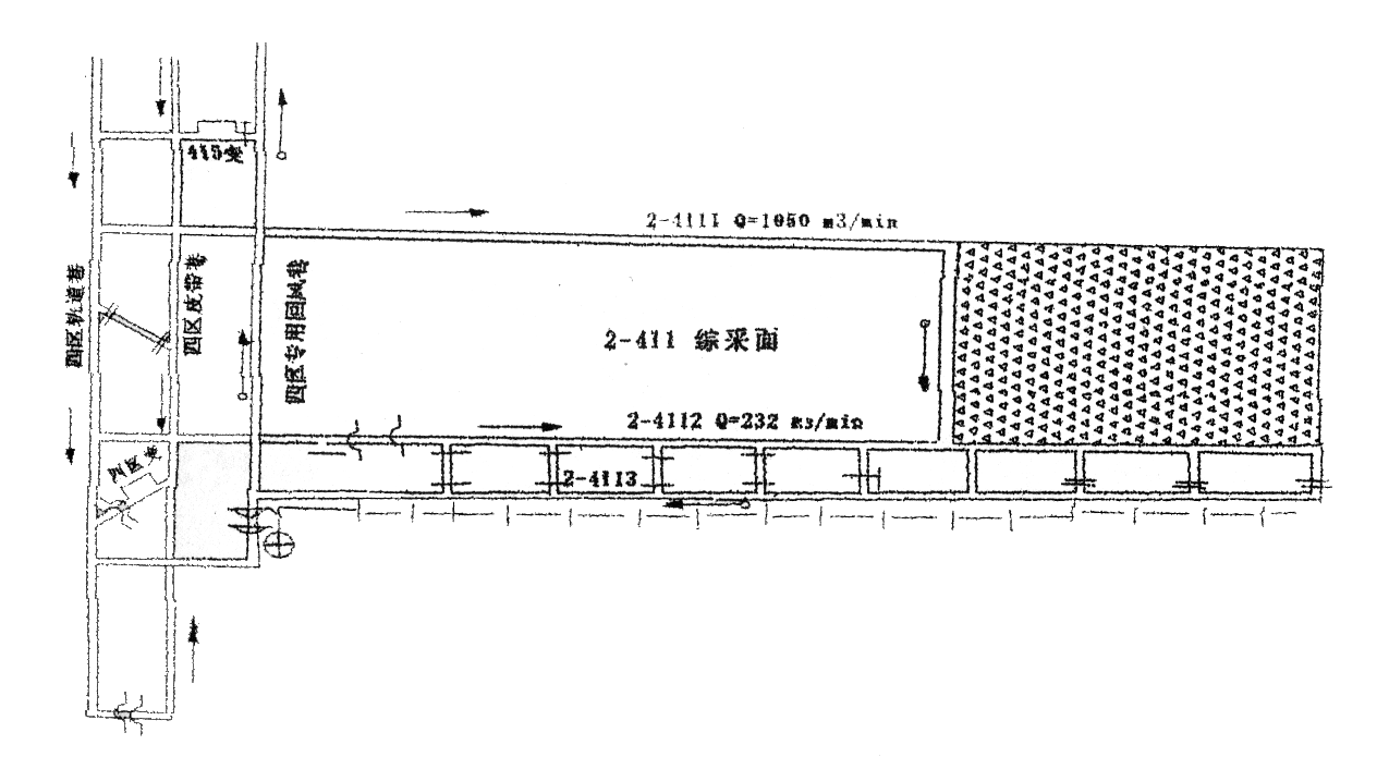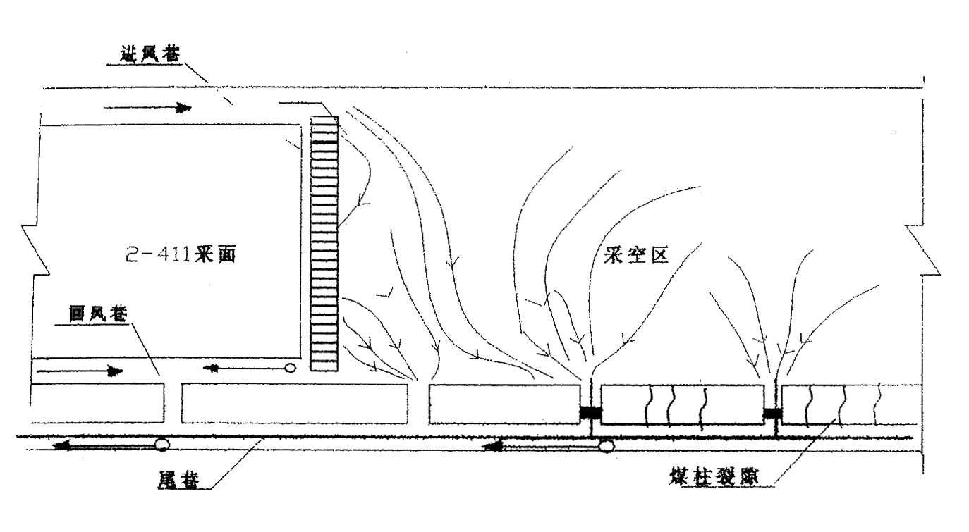 2-411工作面于2003年10月開始回采,工作面瓦斯涌出量約10-15m3/min,其中工作面采空區(qū)瓦斯涌出量較大,占工作面總瓦斯涌出量的60%以上。隨著生產(chǎn)的進(jìn)行,采空區(qū)面積的加大,采空區(qū)瓦斯涌出量有加大的趨勢(shì),采用兩進(jìn)一回通風(fēng)系統(tǒng)雖然緩解了上隅角瓦斯超限問題,但尾巷、液壓支架間仍有瓦斯積聚現(xiàn)象發(fā)生,個(gè)別區(qū)域瓦斯?jié)舛壬踔吝_(dá)到10%,工作面被迫停產(chǎn)近一個(gè)月。