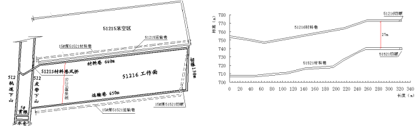 圖1 15號(hào)煤層51521工作面與12號(hào)煤層51216工作面布置與層間位置剖面示意圖