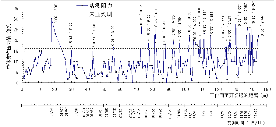 (2)51216工作面平均周期來(lái)壓步距為6.8m。在觀測(cè)期間,周期來(lái)壓步距大部分集中在3.3—9.0m之間。在工作面靠機(jī)尾部步距較大。這是由于該工作面距離15號(hào)煤層間距較大(靠機(jī)尾部約40m),而51216工作面靠機(jī)頭部距離15號(hào)煤層間距較?。s27-30m)。說(shuō)明不同層間距離對(duì)上行開(kāi)采影響程度不同。