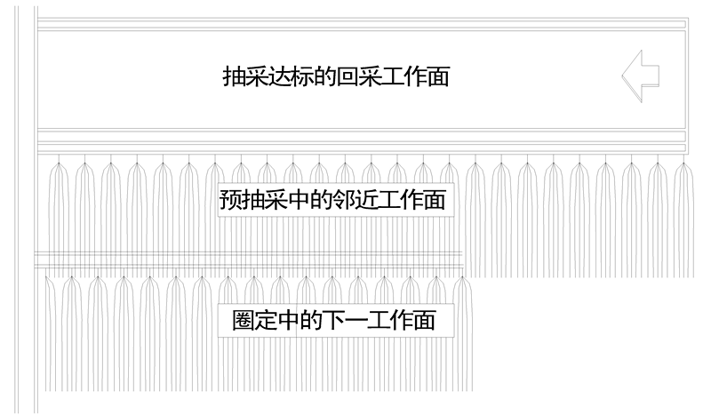 區(qū)域性遞進(jìn)式預(yù)抽采(見圖2)就是利用千米鉆機(jī)等機(jī)具施工長鉆孔,形成一個(gè)較大范圍的瓦斯預(yù)抽區(qū)域,根據(jù)目前千米鉆機(jī)實(shí)際進(jìn)尺水平,一個(gè)預(yù)抽區(qū)域至少應(yīng)涵蓋1個(gè)工作面。
