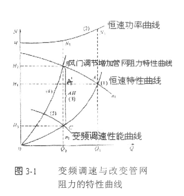 對(duì)風(fēng)機(jī)進(jìn)行調(diào)速控制屬于減少空氣動(dòng)力的節(jié)電方法。它同—般常用的調(diào)節(jié)風(fēng)門控制風(fēng)量方法相比,有著明顯的節(jié)電效益。其節(jié)電原理見(jiàn)圖3-1。