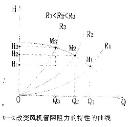 (1)、通過(guò)改變風(fēng)機(jī)的管網(wǎng)阻力特性來(lái)實(shí)現(xiàn)對(duì)風(fēng)機(jī)風(fēng)量的調(diào)節(jié)如 圖3—2所示。