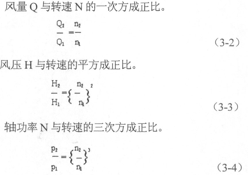 由流體力學(xué)和風(fēng)機(jī)比例定律得出風(fēng)機(jī)、風(fēng)量與轉(zhuǎn)速及軸功率的關(guān)系為: