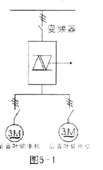 一拖二方式,即利用一臺(tái)合適容量的變頻器同時(shí)拖動(dòng)前置、后置兩級(jí)動(dòng)葉風(fēng)機(jī)電動(dòng)機(jī)(如圖5-1)