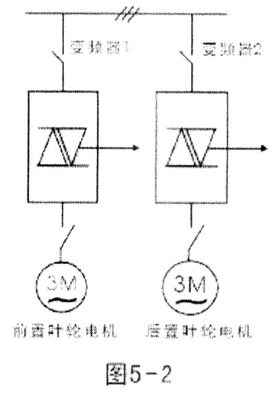 一拖一方式即:利用兩臺(tái)變頻器分別拖動(dòng)前置、后置葉輪電動(dòng)機(jī),如圖5—2: