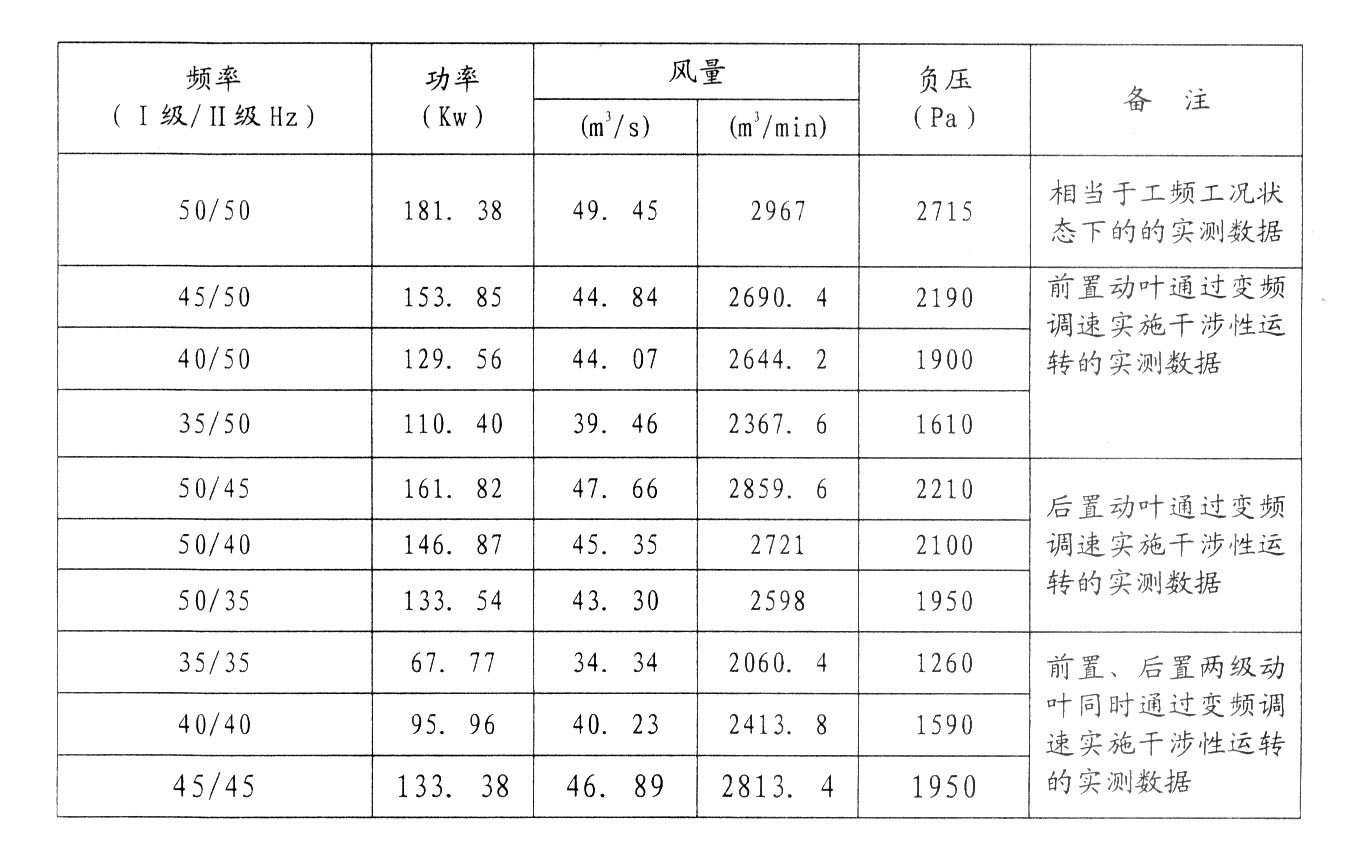 ②對(duì)于對(duì)旋軸流式風(fēng)機(jī)而言,風(fēng)機(jī)節(jié)風(fēng)機(jī)調(diào)整角度有效分格(風(fēng)葉角度)為三格,平均為30度、35度、40度,調(diào)整的適應(yīng)性較差,不能在滿足風(fēng)量需求的情況下達(dá)到應(yīng)有的節(jié)能效果和實(shí)現(xiàn)較高的風(fēng)機(jī)效率。