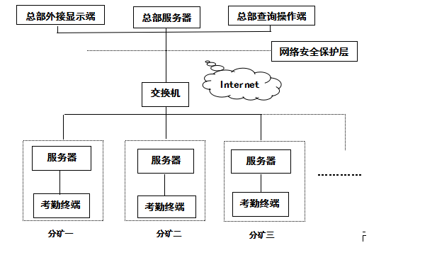 上圖為在不同場所的集團(tuán)使用,各分礦考勤數(shù)據(jù)通過光纖介質(zhì)進(jìn)行