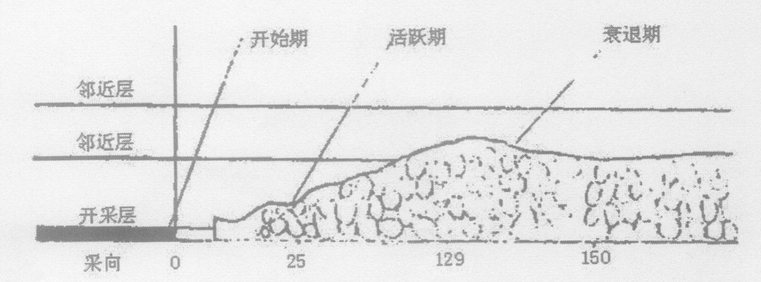 1、通過對綜放工作面上覆巖層活動規(guī)律的研究,綜放工作面開采過程中,從巖石破壞角度分析可確定有冒落帶(或稱垮落帶)、裂隙帶、彎曲下沉帶。冒落帶與裂隙帶分界明顯,最初冒落時,冒落帶之間有可見之空間,壓實區(qū)冒落帶巖石排列紊亂無序