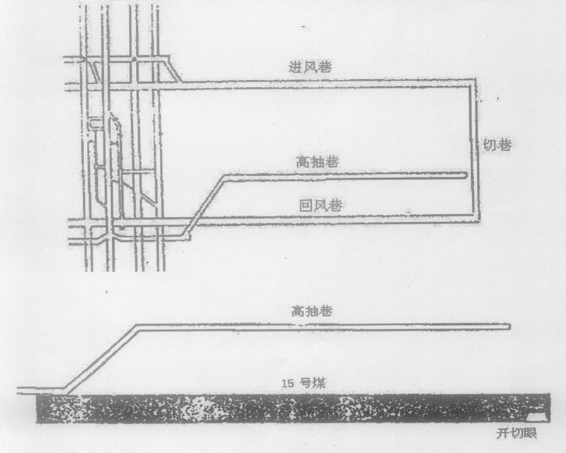 總體思路:開采15號煤層以前采用分層開采,但因產(chǎn)量低,煤層自然發(fā)火嚴(yán)重,后改用綜放開采,產(chǎn)量得到了明顯的提高。然而,產(chǎn)量增大后綜放面初采期瓦斯超限嚴(yán)重,工作面推推停停,一般半個月采完的初采期需要一個半月到兩個月才能采完。正常開采時回風(fēng)流和落山角瓦斯超限頻繁,煤層自然發(fā)火仍然得不到控制,使得綜放開采高產(chǎn)高效的優(yōu)勢難以發(fā)揮。當(dāng)時,煤炭行業(yè)正在全面推廣陽泉瓦斯治理經(jīng)驗,然而,綜放工作面的瓦斯問題尚未得到解決,國內(nèi)外也沒有治理綜放面瓦斯和控制自然發(fā)火的技術(shù)經(jīng)驗,國家也正在進(jìn)行科技攻關(guān)。為此,經(jīng)過集團(tuán)公司研究決定,不惜代價一定要攻關(guān)研究治理綜放工作面的瓦斯、控制自然發(fā)火技術(shù)。其試驗方案和技術(shù)路線是對抽放方式和通風(fēng)方式共同進(jìn)行配套研究試驗的方法,通過對綜放工作面的瓦斯涌出來源分析,以及頂板巖石活動規(guī)律研究,先改進(jìn)通風(fēng)方式,將“U型通風(fēng)方式改為“U+L”型通風(fēng)方式,布置外錯尾巷、外錯尾巷內(nèi)布置大直徑鉆孔和傾斜高抽巷,然后將“U+L”型通風(fēng)方式改為“U+I”型通風(fēng)方式,布置內(nèi)錯尾巷,頂板布置走向高抽巷。初采期采用中低位高抽巷,抽放方式與通風(fēng)方式試驗的最終目標(biāo)是將鉆孔與傾斜高抽巷反向(抽放瓦斯的流動方向與工作面推進(jìn)方向相反)抽放原理改為走向高抽巷正向(抽放瓦斯的流動方向與工作面推進(jìn)方向相同)抽放,合理控制工作面向采空區(qū)內(nèi)部漏風(fēng),從而達(dá)到既提高瓦斯抽放量,減少風(fēng)排瓦斯量,降低回風(fēng)及落山角瓦斯?jié)舛龋钟行Э刂撇煽諈^(qū)漏風(fēng),避免引起自然發(fā)火,實現(xiàn)綜合治理綜放面瓦斯,保障安全生產(chǎn)的目標(biāo)。