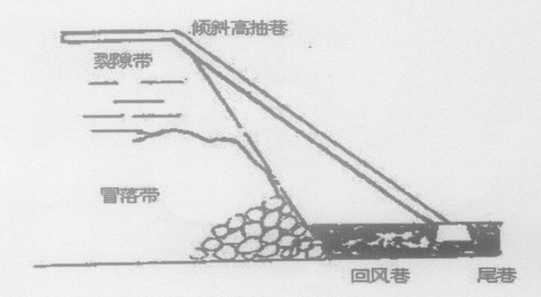 3、在采用外錯尾巷布置時,利用鉆孔不能解決綜放工作面瓦斯涌出量大的問題,采用傾斜高抽巷是解決綜放工作面瓦斯的有效途徑。見圖4所示。