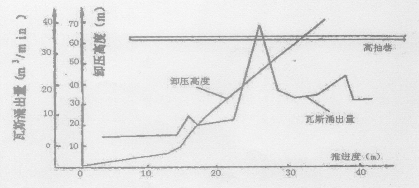 圖6 綜放面初采期頂板卸壓高度、推進(jìn)度與瓦斯涌出關(guān)系示意圖