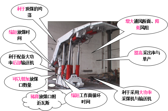 總體思路:結(jié)合綜放開采和大采高綜采兩種采煤方法的優(yōu)點,采用大采高綜放開采實現(xiàn)厚及特厚煤層的安全高效開采。大采高綜放開采,即工作面采煤機(jī)割煤高度大于3.5m的綜放開采。由于大采高綜放工作面割煤高度加大,放煤高度相應(yīng)減小,不僅可增大工作面通風(fēng)斷面、降低工作面風(fēng)阻、縮短放煤時間、提高工作面回收率與單產(chǎn),而且為工作面支架后部通風(fēng)與放煤提供了空間,為工作面放煤口附近瓦斯稀釋提供了保證,有利于工作面實現(xiàn)均衡生產(chǎn);而且工作面割煤高度加大,為充分利用當(dāng)前大功率采煤機(jī)與輸送機(jī)創(chuàng)造了條件,可增加工作面割煤量;工作面采用大采高支架,為工作面配備大功率后部輸送機(jī)提供了空間,并有利于頂煤的垮落;大功率后部輸送機(jī)為工作面增加放煤口數(shù)量提供了保證;隨著大采高支架的高度增加,可有效減少循環(huán)移架、放煤時間,有效地縮短工作面循環(huán)時間,加快工作面推進(jìn)速度,是綜放開采進(jìn)一步實現(xiàn)高產(chǎn)高效的途徑。