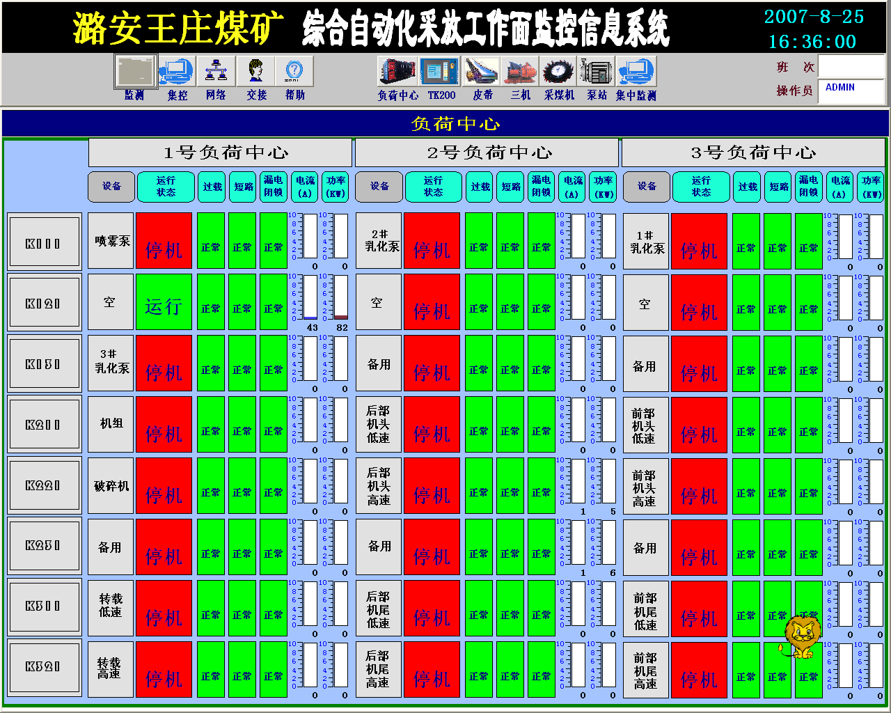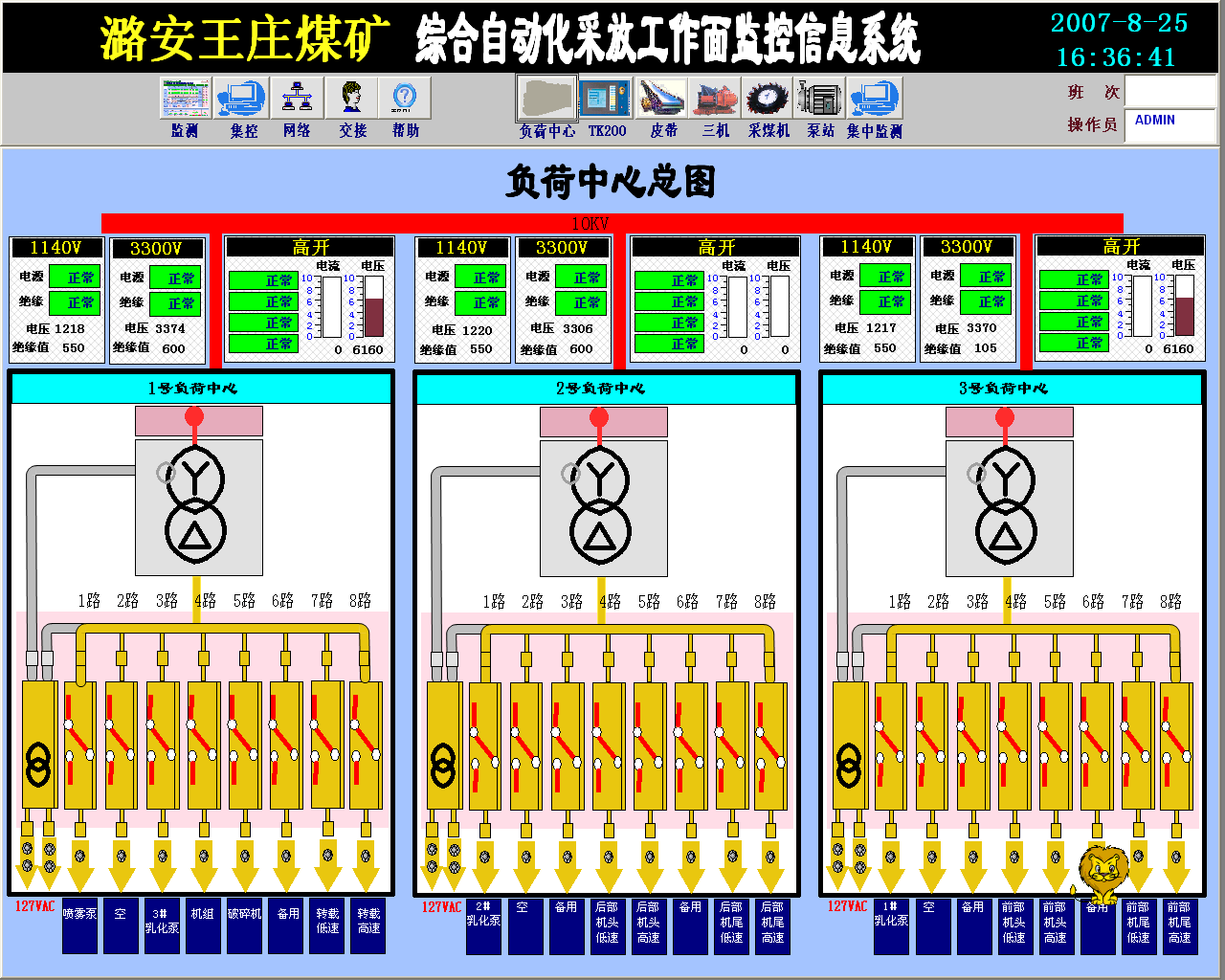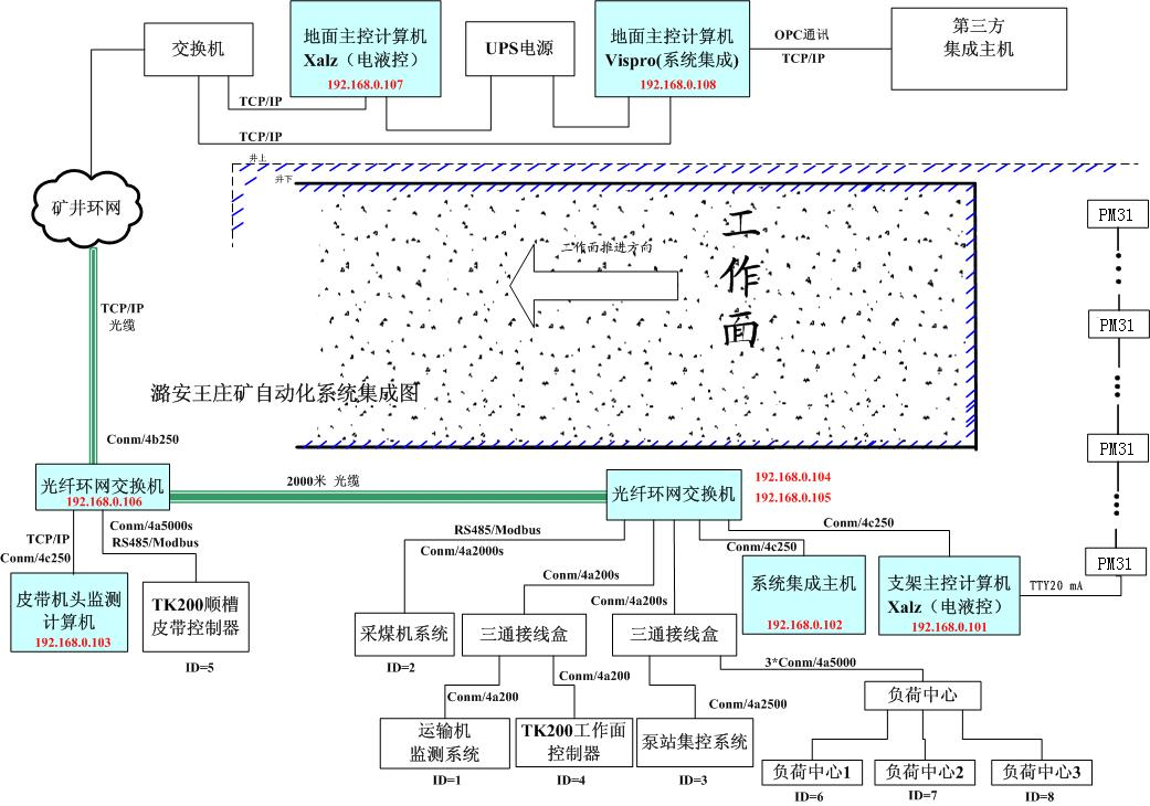 (2)首次將電液控制技術(shù)應(yīng)用于大采高四柱支撐掩護(hù)式綜放設(shè)備;首次采用本安型工業(yè)以太網(wǎng)技術(shù),通過Modbus/TCP總線、標(biāo)準(zhǔn)的OPC接口,實現(xiàn)了系統(tǒng)控制臺對工作面設(shè)備的集中控制,實現(xiàn)了綜放工藝自動化。實現(xiàn)了主運輸、供電設(shè)備的地面集中控制,無人值守。