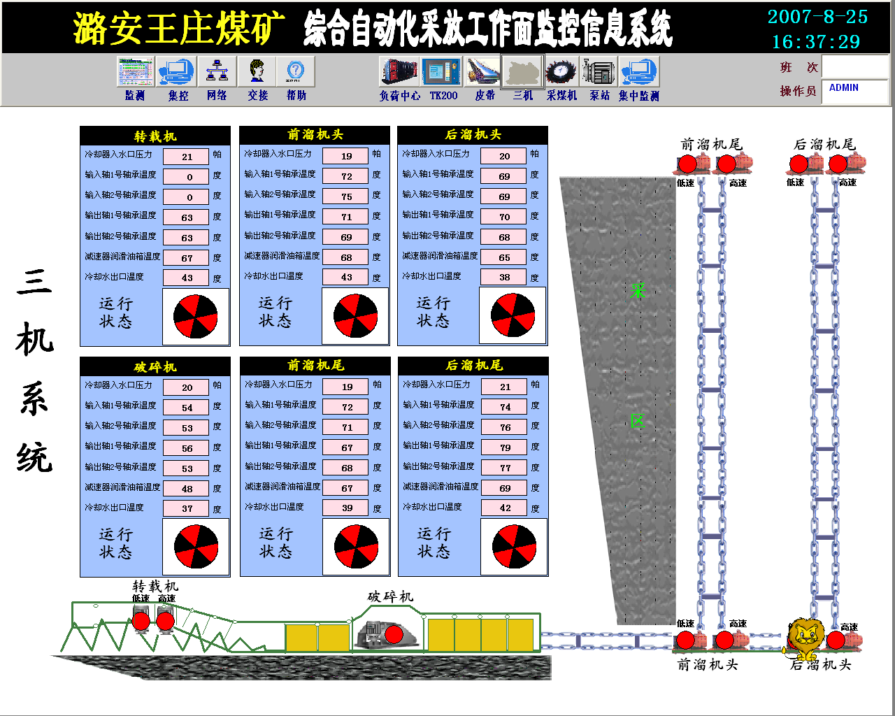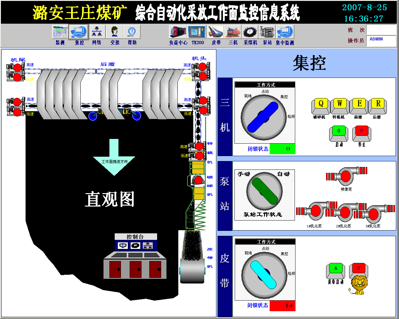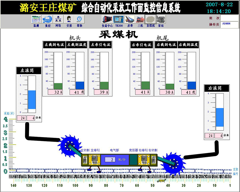 將電液控制技術(shù)應(yīng)用于大采高四柱支撐掩護(hù)式綜放設(shè)備,采用漢字顯示,開發(fā)適合于采放工藝要求的自動跟機(jī)控制程序,達(dá)到采放平衡。采用本安型工業(yè)以太網(wǎng)技術(shù),通過Modbus/TCP總線、標(biāo)準(zhǔn)的OPC接口,實現(xiàn)系統(tǒng)控制臺對工作面設(shè)備的集中控制,實現(xiàn)了綜放工藝自動化。實現(xiàn)主運輸、供電設(shè)備的地面集中控制,無人值守。大幅度提高綜放工作面及環(huán)節(jié)系統(tǒng)自動化水平、安全可靠性,達(dá)到減人提效的目的。