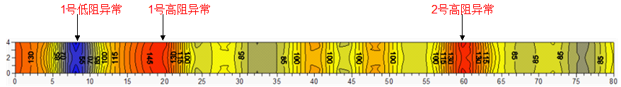 1、本次探測超前距離為80米,最低值為40,最高值為155。 2、探測范圍內(nèi)發(fā)現(xiàn)1處低阻異常和2處高阻異常 經(jīng)驗(yàn)證:通過施工鉆孔,施工6.5m,發(fā)現(xiàn)有水,并對其釋放,共放水1060m3,巷道掘進(jìn)至60m處,發(fā)現(xiàn)有一落差為4.3m的斷層。 |