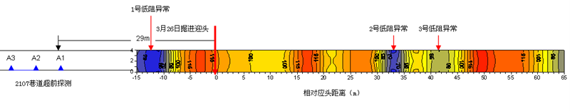 1、2107巷道超前探測控制距離94米,實(shí)測距離65米。 2、在迎頭后方發(fā)現(xiàn)1處低阻異常;迎頭后方發(fā)現(xiàn)2處低阻異常。 經(jīng)驗(yàn)證:巷道掘進(jìn)至前方32米,巷道頂板施工錨索時(shí),錨索孔有淋水。 |