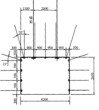 度和高度相匹配。錨索用直徑15.24mm預應力鋼絞線錨索,長度5.2m,錨固長度1.6m,每根錨索使用2卷Z2380型樹脂錨固劑卷。錨索沿巷道掘進方向每隔2.4m(3排錨桿)布置一組,每組2根,分別布置在距巷幫1.1m處,間距為2.0m。在遇見斷層以及跨度較大巷道三、四角門等地段,適當減小錨索排距。