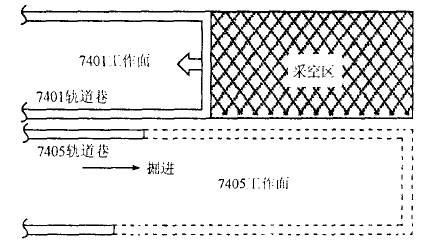 7405工作面是東四采區(qū)的第二個工作面,與采區(qū)首采工作面7401工作面相鄰。因采區(qū)生產接續(xù)需要,在7401工作面回采結束前即進行7405軌道巷的施工。因此, 7405軌道巷在掘進過程中出現(xiàn)了與7401工作面回采相迎的情況,其平面布置關系參見圖2。