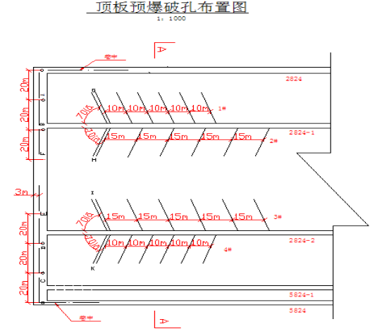 加大頂板預(yù)爆破力度,把原頂板炮15米步距縮小一半,靠采空區(qū)一側(cè)頂板炮孔深增加5—7米,加大預(yù)裂范圍。