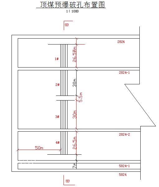 工作面采用“五巷制”布置方式,分別為2824巷、2824-1巷、2824-2巷、5824-1巷,5824巷,其中2824巷為皮帶巷(進風),掘?qū)?.6米,掘高3.0米,(沿底掘進),2824-1巷、2824-2巷為工藝巷(進風),掘?qū)?/span>3.5米,掘高2.4米(沿頂掘進),5824-1巷為回風頂巷(回風),掘?qū)?/span>3.5米,掘高2.4米(沿頂掘進),5824巷為運料回風巷(回風),掘?qū)?.5米,掘高3.5米(沿底掘進)。巷道采用金屬錨桿、錨索支護管理頂板。