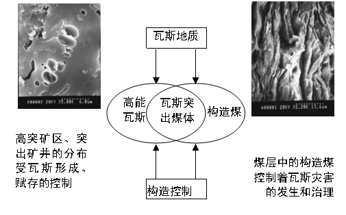 煤與瓦斯突出是一種極其復(fù)雜的動(dòng)力現(xiàn)象,影響因素很多。國(guó)內(nèi)外大量的觀測(cè)研究表明,所有煤與瓦斯突出都發(fā)生在構(gòu)造煤分層,并且在突出過(guò)程中伴隨數(shù)倍于煤層的原始瓦斯含量的瓦斯噴出,說(shuō)明構(gòu)造煤與高能瓦斯及煤與瓦斯突出的關(guān)系密切。構(gòu)造煤是發(fā)生煤與瓦斯突出的物質(zhì)基礎(chǔ),高能瓦斯是發(fā)生煤與瓦斯突出的主要能源,一定厚度的構(gòu)造煤和高能瓦斯賦存是煤與瓦斯突出兩個(gè)必要條件。地質(zhì)構(gòu)造控制著煤層瓦斯的賦存和構(gòu)造煤分層破壞程度以及厚度分布,控制著煤與瓦斯突出,含高能瓦斯的一定厚度的構(gòu)造煤為瓦斯突出煤體,高能瓦斯與一定厚度的構(gòu)造煤的疊加區(qū)域即為煤與瓦斯突出危險(xiǎn)區(qū)(圖1)。