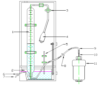 1-量管 2-水槽 3-螺旋夾 4-吸氣球 5—溫度計(jì) 6、8—彈簧夾