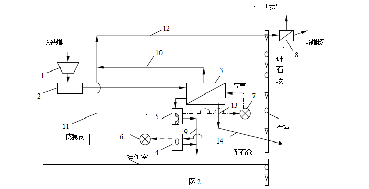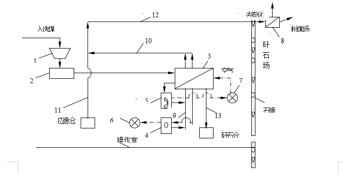 8—煤3#篩子,9—原粉塵皮帶,10—新精煤皮帶,11—舊精煤皮帶,12—煤5#皮帶,13—原矸石皮帶