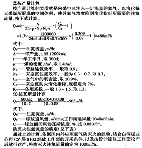 通過(guò)上述計(jì)算,依據(jù)國(guó)內(nèi)外應(yīng)用氮?dú)夥罍缁鸬慕?jīng)驗(yàn),結(jié)合白洞煤業(yè)公司C5 # 層 8102綜放工作面的開(kāi)采條件,以及按設(shè)計(jì)綜放工作面投產(chǎn)后就可達(dá)產(chǎn),將防滅火注氮流量確定為1000m3∕h。