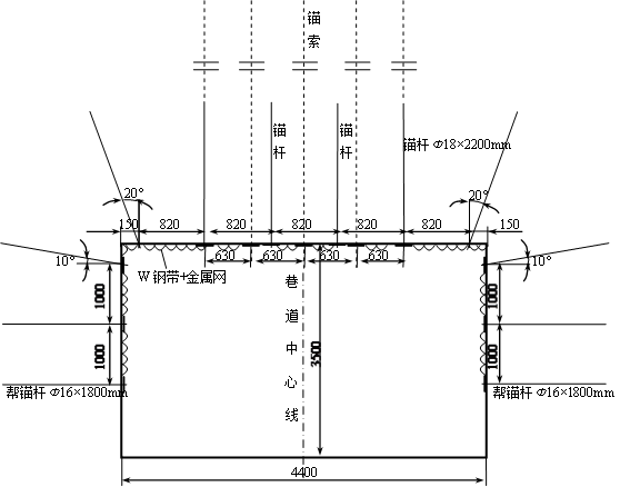此外,為提高巷道幫部的支護(hù)效果,同時(shí)考慮巷道支護(hù)成本,5#煤層?xùn)|軌道大巷兩幫采用普強(qiáng)型號(hào)為Φ16 mm ×1800mm的扭矩應(yīng)力錨桿,錨桿的屈服強(qiáng)度大于8t,抗拉強(qiáng)度大于11t,幫錨桿的安裝載荷 大于2t,安裝扭矩大于100N·m。錨桿托盤規(guī)格尺寸為100 mm×100 mm×5.5mm與270 mm ×300 mm × 2.50 mm的鋼帶托盤配合使用,既可以適應(yīng)錨桿的強(qiáng)度要求,又增加了錨桿的護(hù)幫效果。軌道大巷支護(hù)系統(tǒng)平面圖和剖面圖見圖4。