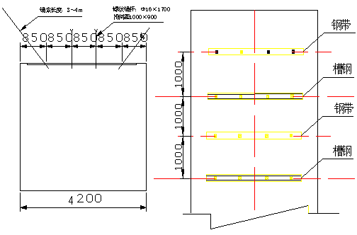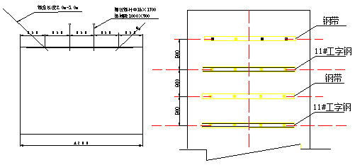 ③、鋼梁棚:錨索梁為11#礦用工字鋼,長(zhǎng)有3.2m、3.6m、3.7m三種,孔距2600mm;鋼梁腿為11#礦用工字鋼,與鋼梁搭接的兩端處焊14#槽鋼且槽口端焊接鋼筋加固,腿凈長(zhǎng)滿足需要,腿腳焊接100×100×10mm的鋼板。