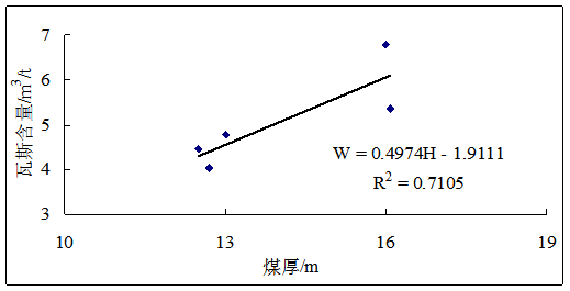 式中,W為瓦斯含量,m3/t;H為煤層厚度,m;相關(guān)性系數(shù)R=0.84,為較高的相關(guān)性。