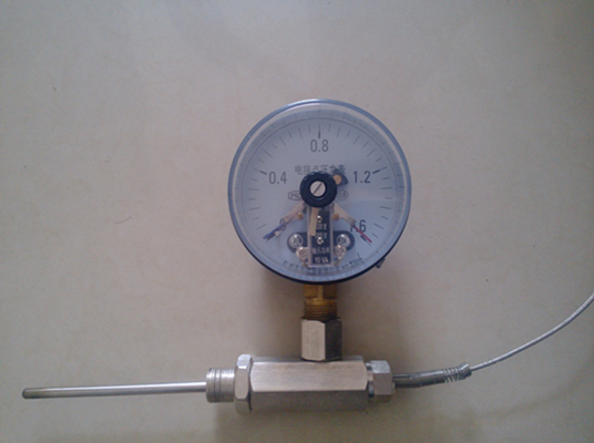 ②將溫度傳感器與其所配套的三通連接在一起,再將風(fēng)包儲(chǔ)氣罐上面的壓力表取下,安裝在所配三通的壓力表接口上,隨后把整套的三通外螺紋端,旋轉(zhuǎn)連接在風(fēng)包儲(chǔ)氣罐上面的壓力表接口處(注:溫度傳感器的安裝必須要配帶‘O’型墊圈,防止漏氣,壓力表的安裝及整套三通與風(fēng)包儲(chǔ)氣罐的連接必須用生膠帶做好防漏氣處理)