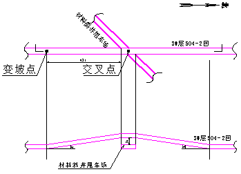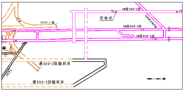 2、2#層、3#層大巷保護煤柱為云崗礦第二個回收煤柱工作面。該煤柱回收過程中采用原有巷道進行修復,并掘進一條回風巷,再圈定工作面對2#、3#煤柱進行回收。由于初期3#層大部分巷道處于密閉狀態(tài),通風、運料系統(tǒng)單一,經(jīng)多方位論證決定504-2回風巷穿過材料斜井甩車場時,需要從巷道上方穿過,保證通風和運料正常運行。