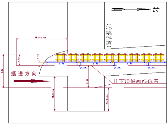 ②地質科提前在空巷頂板給出2637巷變更后3.5m斷面的中線,以及在空巷頂板上距西幫走向線以東0.5m處鋼梁位置線。