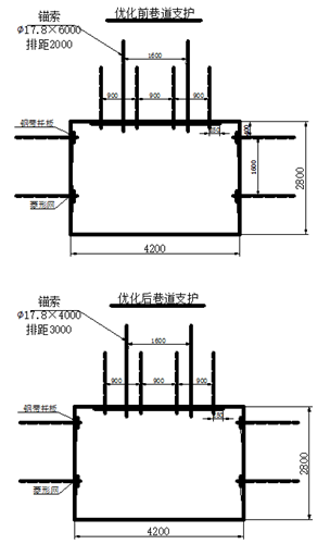 優(yōu)化巷道支護(hù)方面:頂板支護(hù)由原來(lái)的2m排距2根錨索,改為3m排距2根錨索支護(hù),每米巷道節(jié)省4m錨索材料支出,錨索成本9元/m,巷道節(jié)省36元/m;