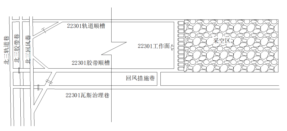 22301工作面井下位于北三盤區(qū)右翼,設(shè)膠帶順槽、軌道順槽、瓦斯治理巷三條巷道。工作面1#、2#、3#煤合采,煤層平均厚度4.75m,切眼長度205m,煤層最大傾角8°,最小傾角2°,平均約4°?;仫L(fēng)措施巷與皮帶順槽開處距離為1600m左右,在工作面回采到22301回風(fēng)措施巷前開始留巷,通風(fēng)系統(tǒng)由U型向Y型轉(zhuǎn)變。