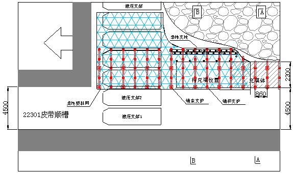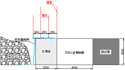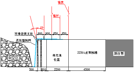 根據(jù)22301工作面生產(chǎn)地質(zhì)條件和礦上條件,選用單體液壓支柱配鉸接頂梁進(jìn)行圍擋臨時支護(hù)。設(shè)置2排密集支柱,割煤后需要在端頭支架4架頂板上方鋪設(shè)柔性塑料網(wǎng),移架后及時在支架后方打設(shè)2排密集支柱+鉸接頂梁支護(hù),使得采空區(qū)側(cè)柔性塑料網(wǎng)下墜在密集單體液壓支柱的外側(cè),防止矸石進(jìn)入充填區(qū)域。具體支護(hù)參數(shù)為:第1排距充填體外側(cè)位置800mm,第2排距充填體外側(cè)1100mm,兩排單體液壓支柱間距300mm左右,交錯布置。