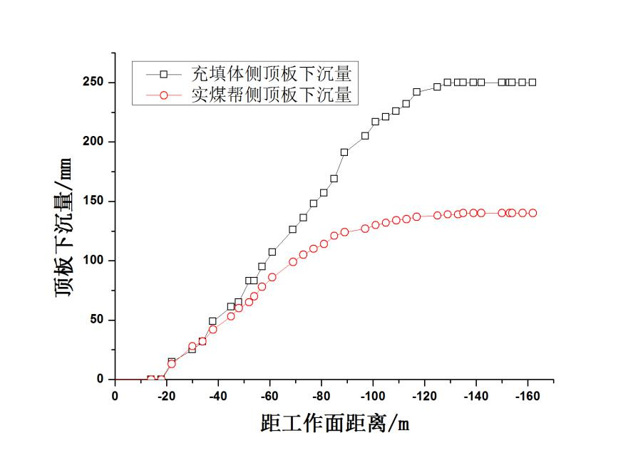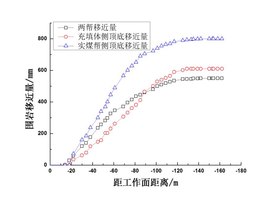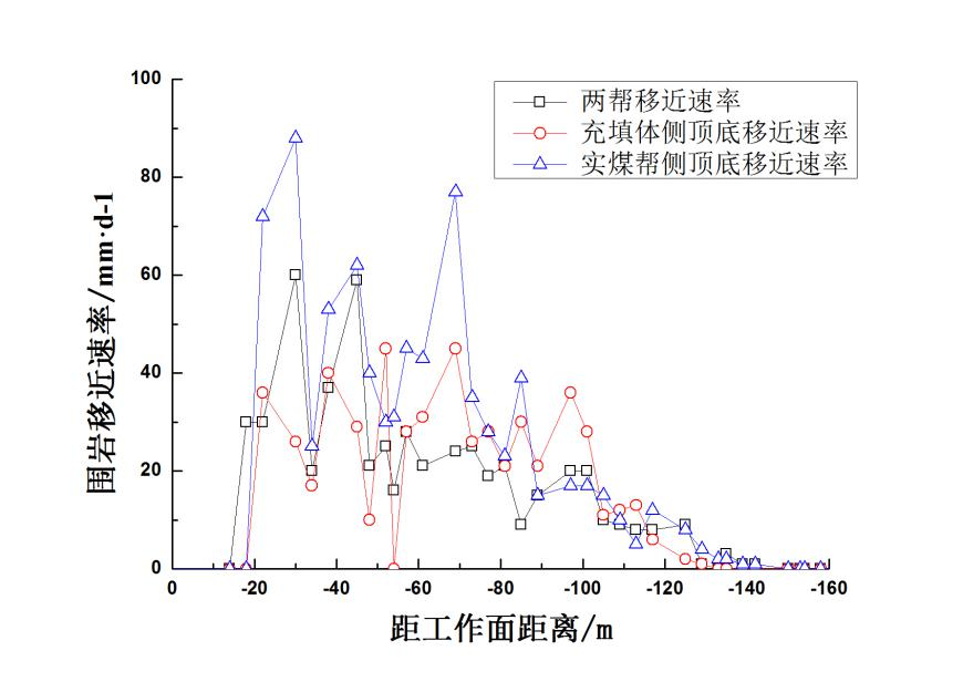 巷道表面位移監(jiān)測結(jié)果表明:(1)工作面后方0~20m范圍內(nèi),頂板幾乎無下沉,圍巖變形較小。(2)工作面后方20m~110m范圍內(nèi),圍巖有較為明顯的變形。其中實煤體幫側(cè)頂?shù)滓平孔畲螅畲笾颠_(dá)到800mm,其中最大頂板下沉量為140mm,底鼓量660mm,可見變形主要是底鼓,充填體側(cè)頂板最大下沉量250mm;兩幫移近量最大為550mm。移近速率都呈現(xiàn)先增大后逐漸變小至零的趨勢。(3)工作面后方110m以外,圍巖變形量很小,變形速率逐漸趨向于零。