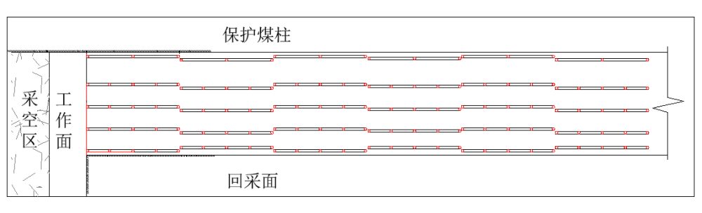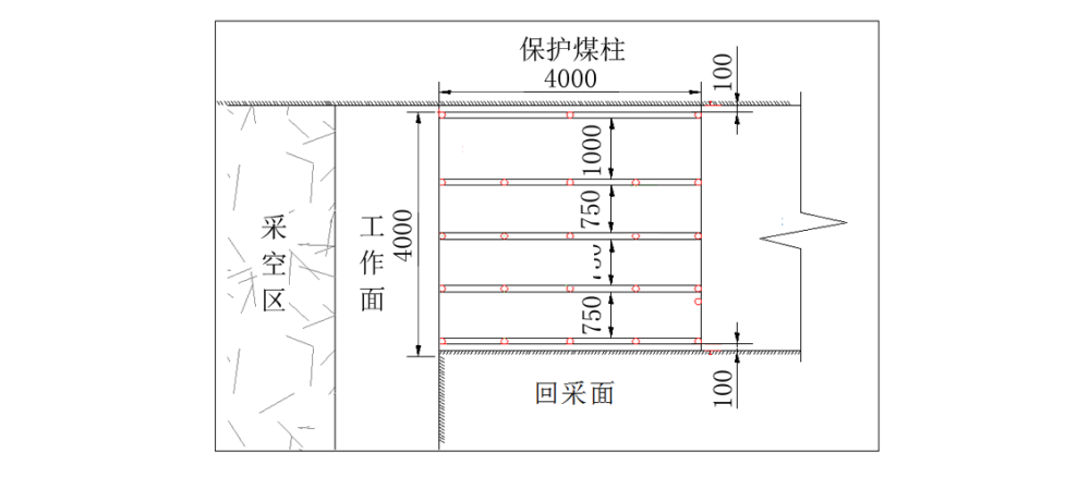 ①在回采過程中,超前支護(hù)布置如下圖6所示。