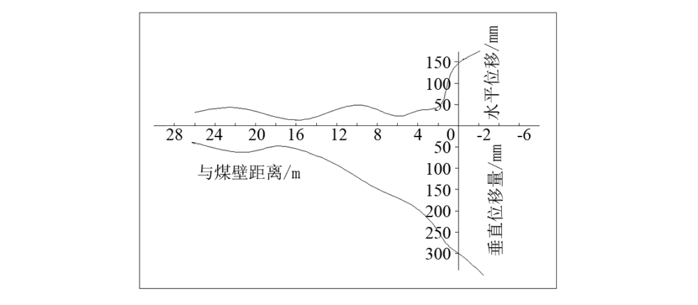 根據(jù)測(cè)試(圖4)表明:隨著回采工作面的推進(jìn),煤壁上覆巖層受力狀態(tài)發(fā)生著變化。煤層位移開始于煤壁前方20m處,隨工作面的接近,其形變量逐漸增大,到8m處較為明顯,距煤壁4m處急劇增加,頂板下沉嚴(yán)重,頂板破碎度增大。