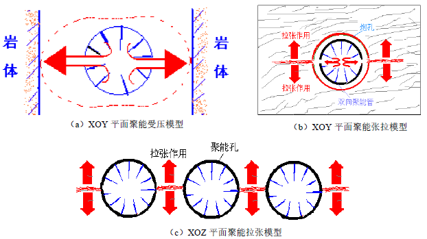 炮孔內(nèi)的炸藥起爆后,爆炸產(chǎn)生的能量沖擊波首先對(duì)聚能裝置所朝向孔壁發(fā)生作用,使其有裂隙產(chǎn)生,受到孔內(nèi)聚能裝置的作用影響,爆轟產(chǎn)生的高能量氣體沿著初始裂隙方向涌入,其作用效果如同氣楔一般,在初始裂隙方向有拉應(yīng)力產(chǎn)生,其整個(gè)作用過程如圖1所示,(a)圖中首先產(chǎn)生聚能壓力作用,巖體孔壁兩側(cè)受到壓應(yīng)力,(b)圖中孔壁整體受壓,而雙向聚能裝置在巖體局部區(qū)域有拉應(yīng)力產(chǎn)生,(c)圖中各炮孔間在軸向系列聚能孔張拉作用下最終形成貫穿裂縫。