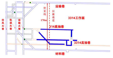 本設(shè)計(jì)采用以“切頂卸壓+恒阻大變形錨索支護(hù)”為主體的設(shè)計(jì)方案,通過預(yù)裂切縫爆破,在局部范圍切斷工作面頂板應(yīng)力傳遞,減弱巷道頂板壓力,且預(yù)裂爆破能夠很好地保護(hù)巷道頂板完整性。利用恒阻大變形錨索對(duì)大巷進(jìn)行補(bǔ)強(qiáng)加固,控制大巷圍巖變形,使所大巷圍巖能夠最大限度地發(fā)揮自身承載作用,減少巷道變形。根據(jù)上述思路,結(jié)合以往工程經(jīng)驗(yàn)和礦方意見,提出了以下設(shè)計(jì)方案。工程實(shí)施過程中,若發(fā)現(xiàn)支護(hù)強(qiáng)度不夠,巷道變形過大,應(yīng)及時(shí)調(diào)整支護(hù)方案,采取應(yīng)對(duì)措施。在3314工作面停采線位置進(jìn)行切頂卸壓。切頂位置如圖2所示。