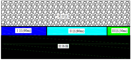 3314工作面煤層直接頂為黑色泥巖、老頂為黑色砂質(zhì)泥巖及粉砂巖、直接底為灰色西粒砂巖、老底為砂巖。根據(jù)工作面工程地質(zhì)條件在3314工作面回撤通道內(nèi)進(jìn)行切頂卸壓施工方案設(shè)計(jì),根據(jù)回撤通道內(nèi)直接頂垮落及頂板上離層情況,將切頂卸壓施工范圍劃分為3個(gè)區(qū)域,即圖4中的Ⅰ區(qū)、Ⅱ區(qū)、Ⅲ區(qū),如圖3所示,切頂卸壓分區(qū)施方案技術(shù)表如表1所示,回撤通道施工剖面如圖4所示。