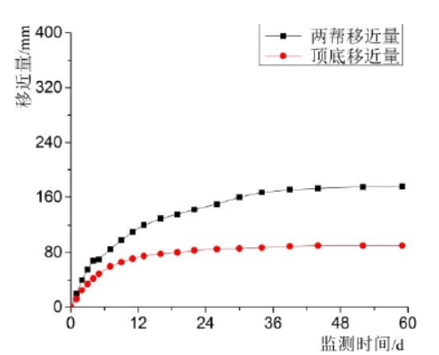 工作面末采時(shí)巖回撤通道進(jìn)行切頂卸壓施工后,為考察雙向聚能爆破切頂卸壓施工的效果,在三采區(qū)運(yùn)輸大巷內(nèi)布置礦壓觀測(cè)站,對(duì)巷道圍巖變形進(jìn)行兩個(gè)月的觀測(cè),繪制如圖5所示的圍巖變形曲線。