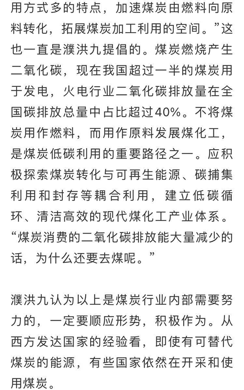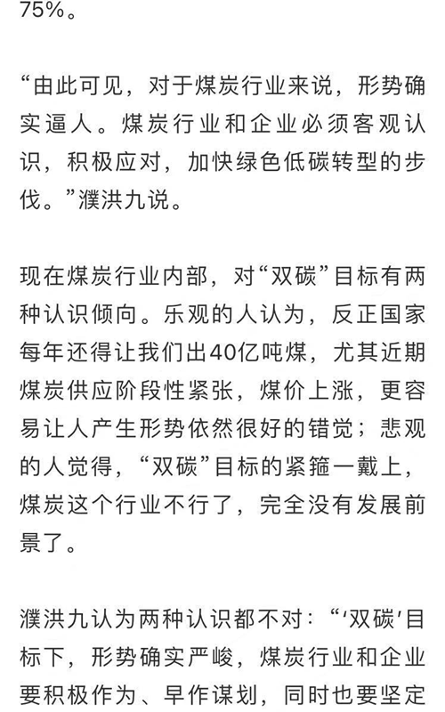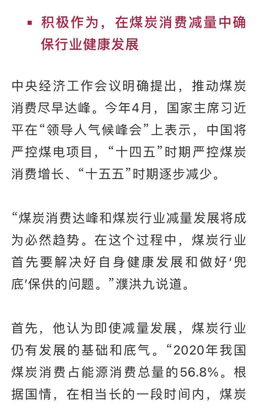 七八年前全國霧霾較為嚴(yán)重時,社會上對煤炭和煤電非議很大。煤炭和電力行業(yè)很快研究出了燃煤電廠超低排放技術(shù),燃煤電廠的污染物排放達(dá)到燃?xì)怆姀S水平。截至2020年底,全國燃煤電廠完成超低排放和節(jié)能改造9.5億千瓦,占全國燃煤電廠總裝機(jī)的76%左右?,F(xiàn)在空氣質(zhì)量好轉(zhuǎn),也很少有因此對煤炭和煤電的非議了。以前煤礦經(jīng)常發(fā)生安全事故,而且煤礦井下工人越來越難招,近幾年,煤炭行業(yè)快速推廣智能化礦山建設(shè)。截至2020年底,全國已建成400多個智能化采掘工作面,采煤、鉆錨、巡檢等19種煤礦機(jī)器人在井下實(shí)施應(yīng)用,71處煤礦列入國家首批智能化示范建設(shè)煤礦。井下工作面用人大幅減少,煤礦職工作業(yè)環(huán)境安全系數(shù)提高了,勞動強(qiáng)度降低了??梢灶A(yù)見,將來的煤礦將更安全高效智能,煤炭行業(yè)從勞動密集型行業(yè)正在向技術(shù)密集型行業(yè)轉(zhuǎn)變。“這些科技上的突破,給煤炭行業(yè)帶來了生機(jī),也給了煤炭人應(yīng)對新挑戰(zhàn)的信心。” 濮洪九說,“認(rèn)清形勢,是為了積極認(rèn)真應(yīng)對,同時也應(yīng)有堅(jiān)定的信心,前路都是靠自己一點(diǎn)點(diǎn)探出來的?!?span style="font-family:宋體;font-size:10.5pt;"> “雙碳”目標(biāo)一公布,有些煤炭企業(yè)就開始研究制定應(yīng)對方案了。例如,國家能源集團(tuán)去年12月就組織召開“碳中和愿景下我國能源轉(zhuǎn)型戰(zhàn)略研討會”,啟動研究率先引領(lǐng)能源煤炭電力行業(yè)碳達(dá)峰、碳中和的戰(zhàn)略路徑?,F(xiàn)在他們已提出到2025年提前實(shí)現(xiàn)碳達(dá)峰。再例如,晉能控股集團(tuán)與中國煤炭科工集團(tuán)簽署“碳達(dá)峰、碳中和”戰(zhàn)略研究合作協(xié)議,并第一時間成立了“碳達(dá)峰、碳中和”戰(zhàn)略研究工作組,積極探索能源低碳減量可行先進(jìn)技術(shù),穩(wěn)步推進(jìn)全產(chǎn)業(yè)鏈效率提升、節(jié)能減排。還有其他一些大企業(yè),也紛紛研究應(yīng)對策略。濮洪九希望全行業(yè)能對此更重視,有更多的企業(yè)積極行動起來。“人無遠(yuǎn)慮,必有近憂。對于煤炭行業(yè)和企業(yè),‘雙碳’目標(biāo)的約束已是近憂了,必須主動考慮,盡快根據(jù)形勢、政策和企業(yè)自身的實(shí)際情況,做出頂層設(shè)計(jì),規(guī)劃轉(zhuǎn)型線路圖?!?span style="font-family:宋體;font-size:10.5pt;">
