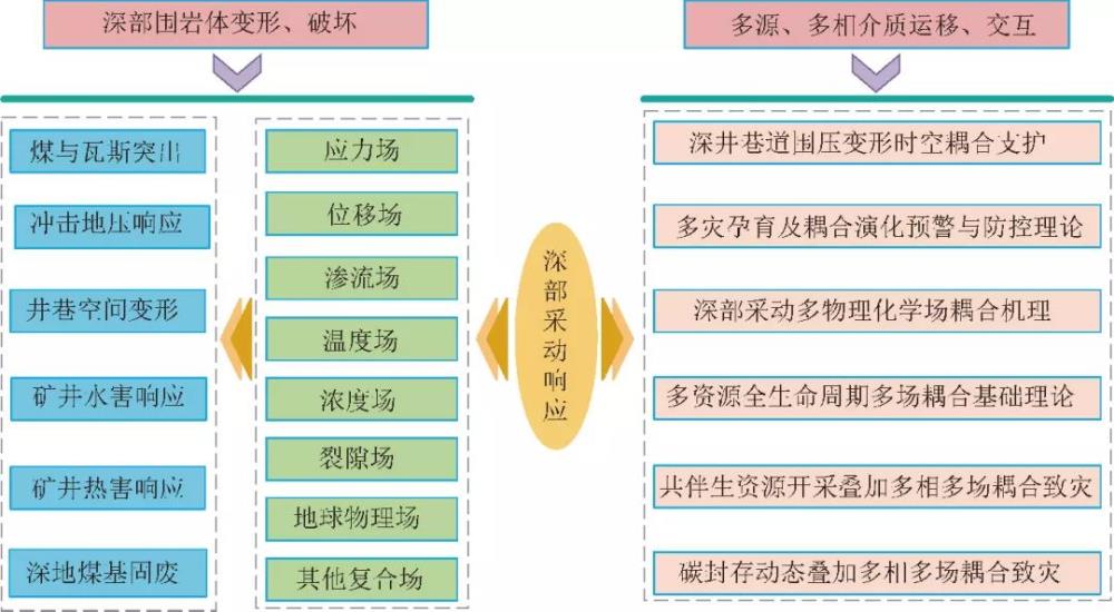 (1)聚焦深部采動煤巖體響應關鍵理論和多場耦合致災機制,結合人工智能、大數(shù)據(jù)等為代表的科技革命創(chuàng)新成果,分析深部采動災害防控關鍵技術,助力實現(xiàn)深地資源安全高效開采。(2)深部采動響應具有明顯的空間性和時序性。開采擾動影響下,圍巖內(nèi)部結構和原位應力場失衡,引發(fā)巖層運移,空間特征表現(xiàn)出明顯的“分帶性”和“形態(tài)性”;煤炭開采時序響應貫穿井巷空間設計、建設至煤體采出、采區(qū)范圍煤 巖體穩(wěn)定及地表生態(tài)恢復的全過程。(3)深部采動過程中,多物理化學場時空動態(tài)演化規(guī)律復雜,多資源全生命周期動態(tài)疊加多相多場耦合效應明顯,需要實現(xiàn)耦合災害的超前感知、精準定位和高效預警,為煤及共伴生資源安全開采提供保障。